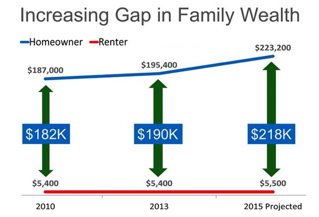 Below is a chart showing the aforementioned increasing gap between renters and homeowners in regard to family wealth: